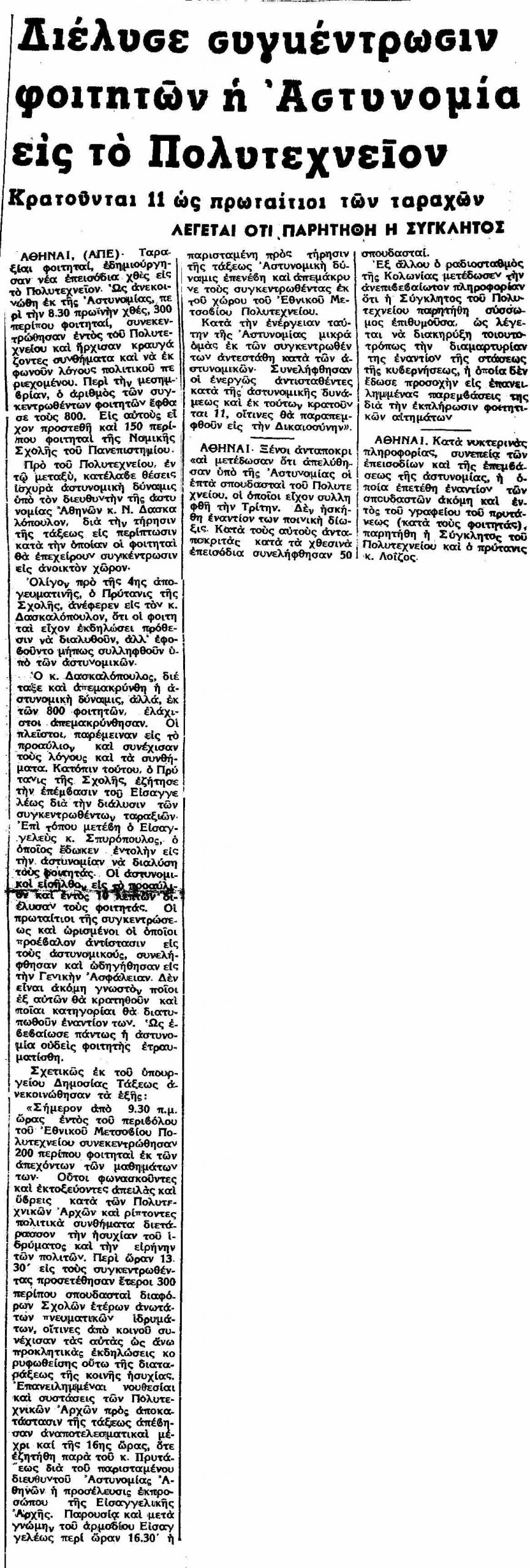 Πηγή: “Κρατούνται 11 ως πρωταίτιοι των ταραχών.” Εφ. “Ημέρα”, 15-02-1973