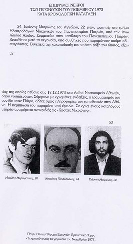 – Στη σελ. 52 του ίδιου βιβλίου αναφέρεται: “Ο Ι. Μικρώνης του Αγγέλου, 22 ετών, φοιτητής, του Τμήματος Ηλεκτρολόγων Μηχανικών του Πανεπιστημίου Πατρών από τον Άνω Αλυσσό Αχαϊας. Συμμετείχε στην κατάληψη του Πανεπιστημίου Πατρών. Κτυπήθηκε μετά τα γεγονότα υπό συνθήκες που παραμένουν ακόμα αδιευκρίνηστες. Συνεπεία της κακοποίησής του υπέστη ρήξη του ήπατος εξ’ αιτίας της οποίας πέθανε στις 17-12-1973 στο Λαϊκό Νοσ. Αθηνών όπου νοσηλευόταν. Σύμφωνα με ορισμένες ενδείξεις, ο τραυματισμός του συνέβη στην Πάτρα, άλλες όμως πληροφορίες τον τοποθετούν στην Αθήνα. Η περίπτωσή του παραμένει υπό έρευνα. Σε ορισμένους καταλόγους νεκρών αναφέρεται ανακριβώς ως Κώστας Μικρώνης.