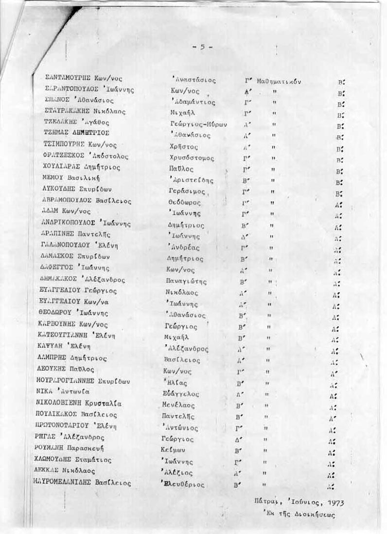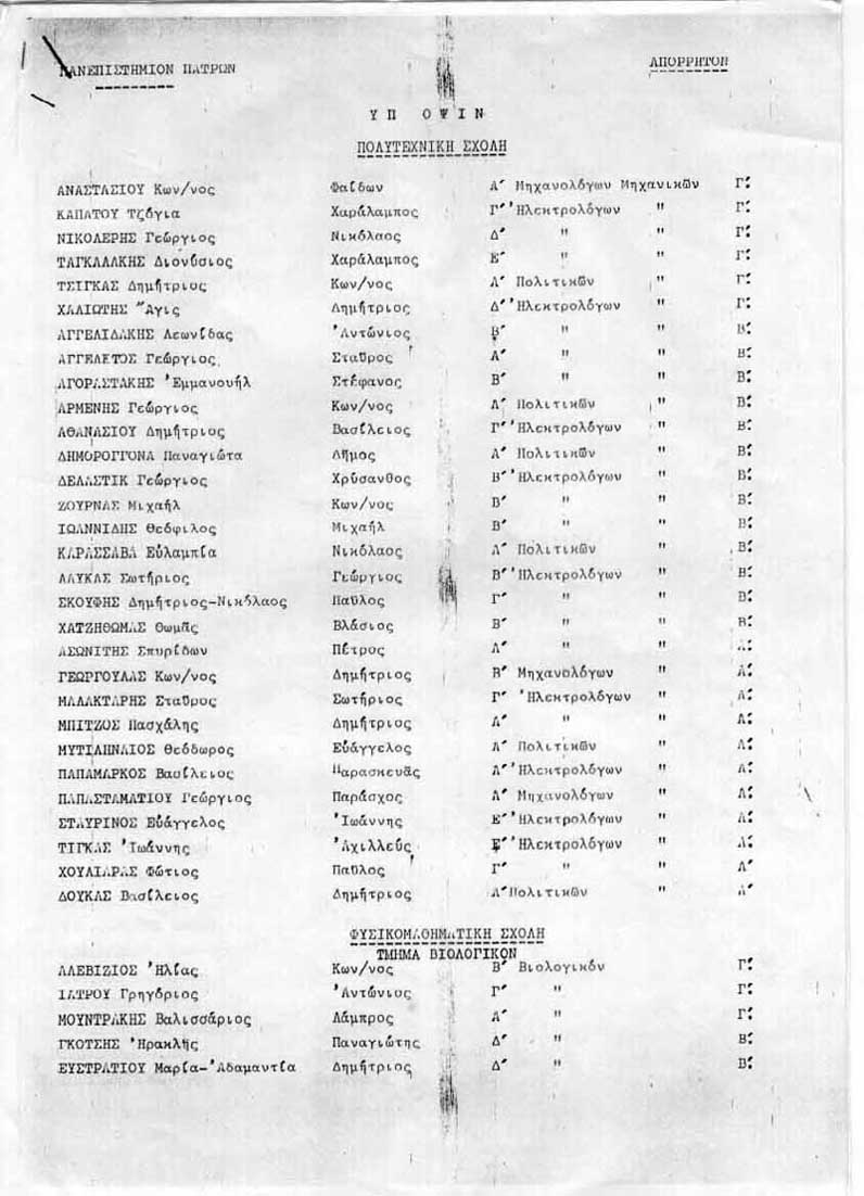 Τα ονόματα πολλών από τους παλιούς συναγωνιστές του αντιδικτατορικού φοιτητικού κινήματος της Πάτρας εμφανίζονται στη πρωτότυπη κατάσταση που ακολουθεί. Πρόκειται για τον περίφημο κατάλογο των “χαρακτηρισμένων” συντρόφων από την Ασφάλεια… Η “αρχική” αυτή λίστα των φακελλωμένων φοιτητών συντάχθηκε από την Ασφάλεια και κοινοποιήθηκε από τον τότε διορισμένο από τη Χούντα πρόεδρο της Δ.Ε. του Παν/μιου στρατηγό Αχ. Τάγαρη στους καθηγητές, για να λάβουν γνώση και να ενεργήσουν “δεόντως”. Η κατάσταση είναι ανυπόγραφη. Το διαβιβαστικό που τη συνόδευε δεν έχει ακόμα βρεθεί και αναζητείται…