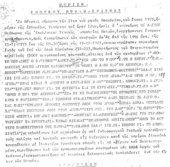 Εν Πάτραις σήμερον την 21ην του μηνός Νοεμβρίου, τού ‘Ετους 1973, ημέραν της εβδομάδος Τετάρτην και ώραν 12ην, ημείς ο Αστυνόμος Β’ ΛΑΓΙΟΣ Θεόδωρος της Υποδιευθύνσεως Γενικής Ασφαλείας Πατρών, ενεργήσαντες ένορκον προανάκρισιν, προς διακριβωσιν των συνθηκών υφ’ ας από της 14ης ώρας της 15-11-1973 έως της 0.3.30′ ώρας της 27-11-1973, συνεκεντρώθησαν παρανόμως εντός του επί της οδού Κορίνθου 231-233, Παραρτήματος του Πανεπιστημίου περί τους (500) πεντακοσίους φοιτητάς, οίτινες δια των συνθημάτων: “ΑΠΟΨΕ ΠΕΘΑΙΝΕΙ Ο ΦΑΣΙΣΜΟΣ”, “ΛΑΟΚΡΑΤΙΑ”, “ΕΞΩ ΑΠΟ ΤΟ ΝΑΤΟ”, “ΚΑΤΩ Η ΧΟΥΝΤΑ”, “ΠΑΠΑΔΟΠΟΥΛΕ ΛΗΣΤΗ, ΑΓΓΕΛΗ ΒΑΣΑΝΙΣΤΗ”, “ΔΕΝ ΣΕ ΕΛΕΙ Ο ΛΑΟΣ ΠΑΡ’ ΤΗ ΔΕΣΠΙΝΑ ΚΑΙ ΜΠΡΟΣ”, “ΜΑΡΚΕΖΙΝΗ ΜΑΣΚΑΡΑ”, “ΕΠΑΝΑΣΤΑΣΗ ΛΑΕ”, “ΟΙΚΟΔΟΜΟΙ-ΦΟΙΤΗΤΕΣ”, “ΕΛΛΑΣ ΧΙΛΗ ΚΑΙ ΙΣΠΑΝΙΑ ΕΜΠΡΟΣ ΓΙΑ ΤΗ ΔΗΜΟΚΡΑΤΙΑ”, “ΟΛΟΙ ΣΤΟΝ ΑΓΩΝΑ”, “ΛΑΕ ΗΛΘΕ Η ΩΡΑ ΓΙΑ ΑΓΩΝΑ”, “ΕΝΑΣ ΕΙΝΑΙ Ο ΑΡΧΗΓΟΣ Ο ΕΛΕΥΘΕΡΟΣ ΛΑΟΣ”, “ΕΛΕΥΘΕΡΙΑ-ΔΗΜΟΚΡΑΤΙΑ-ΛΑΟΚΡΑΤΙΑ”, “ΕΡΓΑΤΕΣ ΜΠΡΟΣ ΓΙΑ ΤΗ ΛΕΥΤΕΡΙΑ ΚΑΙ ΤΗ ΚΥΡΙΑΡΧΙΑ”, “ΣΥΜΠΑΡΑΣΤΑΣΗ ΛΑΕ”, “ΗΡΘΕ Η ΩΡΑ ΤΗΣ ΛΕΥΤΕΡΙΑΣ”, “ΕΣΑ ΕΣ-ΕΣ ΒΑΣΑΝΙΣΤΕΣ”, “ΟΙ ΠΡΟΔΟΤΕΣ ΣΤΟ ΓΟΥΔΙ”, “ΚΑΤΩ Ο ΦΑΣΙΣΜΟΣ”, “ΕΛΛΑΣ ΕΛΛΗΝΩΝ ΦΥΛΑΚΙΣΜΕΝΩΝ”, “Ο ΛΑΟΣ ΠΕΙΝΑΕΙ ΣΕ ΛΙΓΟ ΘΑ ΣΑΣ ΦΑΕΙ”, “ΕΡΓΑΤΕΣ ΑΓΡΟΤΕΣ ΦΟΙΤΗΤΕΣ ΟΛΟΙ ΣΤΟΝ ΑΓΩΝΑ, “ΚΥΡΙΑΡΧΙΑ ΣΤΟ ΛΑΟ”, “ΔΟΥΛΑ-ΔΟΥΛΑ- ΣΠΥΡΙΔΟΥΛΑ”, “ΟΛΟΙ ΕΝΩΜΕΝΟΙ ΟΛΟΙ ΣΤΟΝ ΑΓΩΝΑ”, “ΚΥΡΙΑΡΧΙΑ ΣΤΟ ΛΑΟ”, “ΤΩΡΑ Η ΠΟΤΕ”, “ΓΕΝΙΚΗ ΑΠΕΡΓΙΑ ΕΡΓΑΤΕΣ-ΦΟΙΤΗΤΕΣ”, “ΑΠΕΡΓΙΕΣ ΔΙΑΔΗΛΩΣΕΙΣ”, “ΘΑΝΑΤΟΣ ΣΤΟΝ ΤΥΡΑΝΝΟ”, “ΕΡΓΑΤΕΣ ΤΑ ΕΡΓΟΣΤΑΣΙΑ ΕΙΝΑΙ ΔΙΚΑ ΣΑΣ”, “ΩΡΓΑΝΩΘΕΙΤΕ-ΑΝΤΙΣΤΑΘΕΙΤΕ”, “ΖΗΤΩ ΤΟ ΛΕΥΤΕΡΟ ΠΑΝΕΠΙΣΤΗΜΙΟ ΤΗΣ ΠΑΤΡΑΣ”, “ΤΑΥΛΑΝΔΗ-ΕΛΛΑΣ-ΙΣΠΑΝΙΑ ΕΜΠΡΟΣ ΓΙΑ ΤΗ ΔΗΜΟΚΡΑΤΙΑ”, μεταδοθέντων δια μεγαφώνων ως και Ραδιοφωνικού Σταθμού προεκάλουν τους πολίτας και λοιπούς φοιτητάς είς διέγερσιν κατά της νομίμου εξουσίας, προεκάλεσαν με ιδιαιτέρα θρασύτητα φθοράς εις το κτίριον του Πανεπσιτημίου, περιύβρισαν δια των προαναφερομένων συνθημάτων τας αρχάς του Κράτους, επραγματοποίησαν δε τετράκις οχλοκρατικάς διαδηλώσεις ανά την Πόλιν των Πατρών.